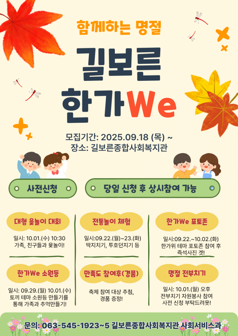 [교육문화] 가족과 친구와 함께하는 명절! 한가We 참여자 모집 페이지 정보 작성자 관리자 댓글 0건 조회 1,653회 작성일 25-09-17 16:34 본문 전화접수: 063-545-1923~5 길보른종합사회복지관 사회서비스과 교육문화담당 목록 이전글제30회 지평선 전국 청소년가요제 접수 마감 25.09.23 다음글[교육문화] 2025년 가을학기 교육문화프로그램 참여자 모집 25.09.17