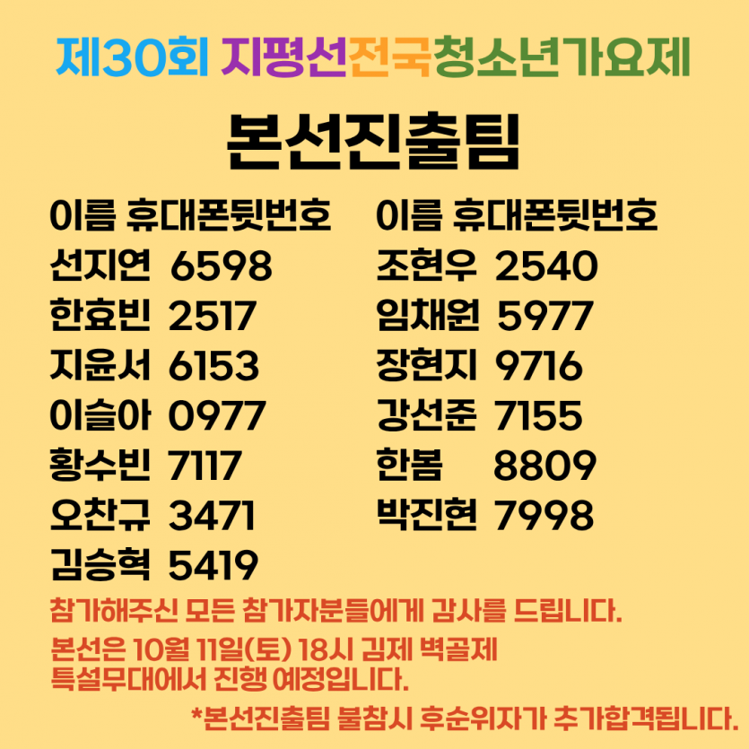 제30회 지평선 전국 청소년가요제 본선진출팀 안내 페이지 정보 작성자 관리자 댓글 0건 조회 1,417회 작성일 25-09-29 14:55 본문 목록 이전글2025년 김제중앙MJF라이온스클럽과 함께하는 김제시청소년응원프로젝트 시즌6 「네 꿈을 응원해」 참여자 모집 25.10.01 다음글제30회 지평선 전국 청소년가요제 접수 마감 25.09.23
