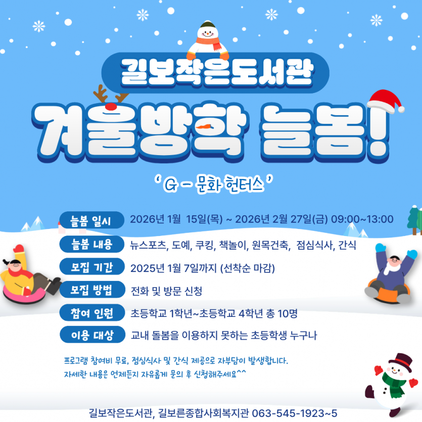 2026년 겨울방학 늘봄 프로그램 참여자 모집 페이지 정보 작성자 관리자 댓글 0건 조회 3,526회 작성일 25-12-23 16:52 본문 목록 이전글2025년 제3차 길보른종합사회복지관 시설회계 세입․세출 추가경정예산 공고 25.12.26 다음글2026년 노인사회활동지원사업 전담인력 채용시험 최종합격자 명단 공고 25.12.19