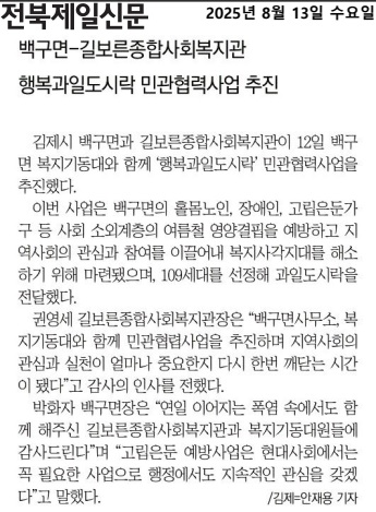 이번 ‘행복과일도시락’ 사업은 백구면(면장 박화자)과 길보른종합사회복지관(관장 권영세)이