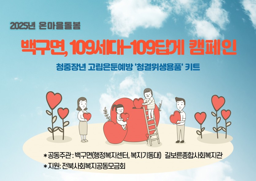 【온마을돌봄_고립예방】#86 109세대_109답게 4번째 캠페인 페이지 정보 작성자 관리자 댓글 0건 조회 4,315회 작성일 25-10-30 12:00 본문 #온마을돌봄_고립예방사업#4번째_캠페인_청중장년_청결위생#마을이야기_86번째#김제시_백구면_사랑의열매다가오는 10월 29일, 백구면행정복지센터, 복지기동대와 연대하여 #109세대_109답게 4번째 캠페인청중장년 고립은둔대상 '청결위생용품' 키트 사업을 진행합니다. 매월 민관민이 함께 기획하고지역내 주민, 이웃이 방문-전달-살펴봐주는고위험세대는 민관이 직접 대응하는고립은둔 Zero 김제시를 지향합니다. 목록 이전글[길보작은도서관] 아로마북테라피 후기 25.10.30 다음글【온마을돌봄_고립예방】#85 "아직 어렵네요. 그래도 동행해줘서 고맙습니다" 25.10.30