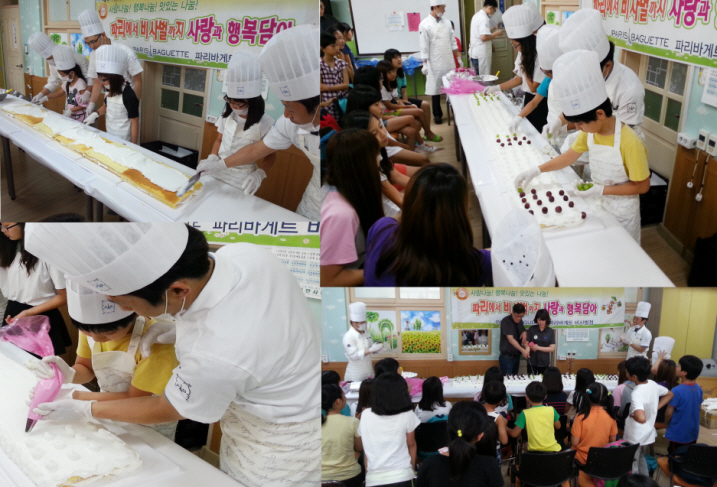 파리바게뜨 비사벌점(대표: 이은숙)은 맛있는 나눔을 실천하기 위해, 가까운 전주에서 또는 조금 먼 광주에서 전문제빵사님들을 모시고 김제시 검산초등학교를 찾아가, 50여명의 아동들과 함께 5m가 넘는 대형케익을 직접 참여하여 만들고 함께 나누는, 소박하고 따뜻한 나눔의 시간을 보냈습니다.