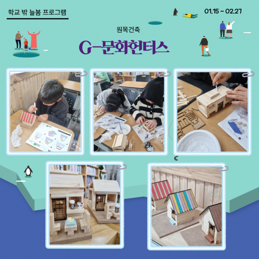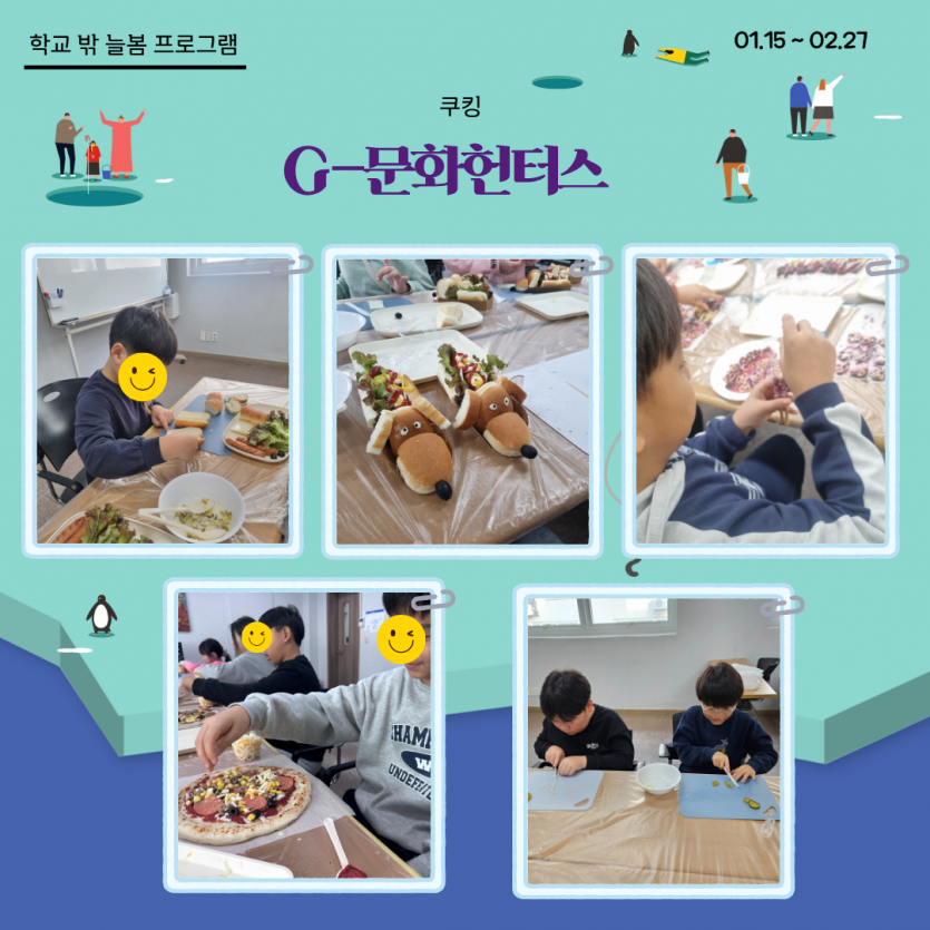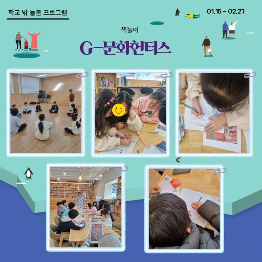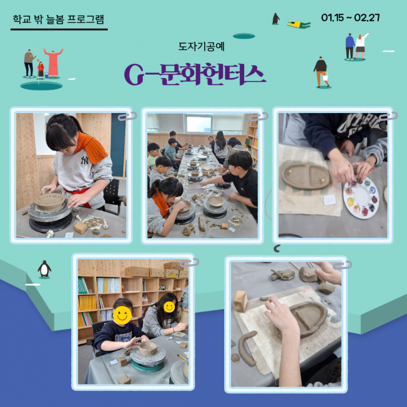 [길보작은도서관] G-문화 헌터스 프로그램이 마무리되고 있습니다. ^^ 페이지 정보 작성자 관리자 댓글 0건 조회 2,025회 작성일 26-02-20 16:06 본문 아이들의 시야가 세계로 넓어지는 특별한 겨울! 길보작은도서관에서 진행되는 G-문화 헌터스가 마무리되고 있습니다.도예와 요리로 오감을 깨우고책놀이와 스포츠. 원목건축을 통해지구촌 이웃들의 삶을 깊이있게 경험했습니다. 단순한 체험을 넘어,타인에 대한 공감능력을 기르고세계관을 한 뼘 더 확장하는 소중한 성장의 시간이었습니다. 부쩍 자란 우리 아이들의 넓은 마음을 함께 응원해주세요! 목록 이전글[가족기능강화] 꿈디자이너사업 연합캠프 "꿈에 나를 더하다!" 진행 26.02.25 다음글[국민연금수급자아카데미] 리컬러: 다시 그리는 나의 삶 참여자 모집 26.02.20