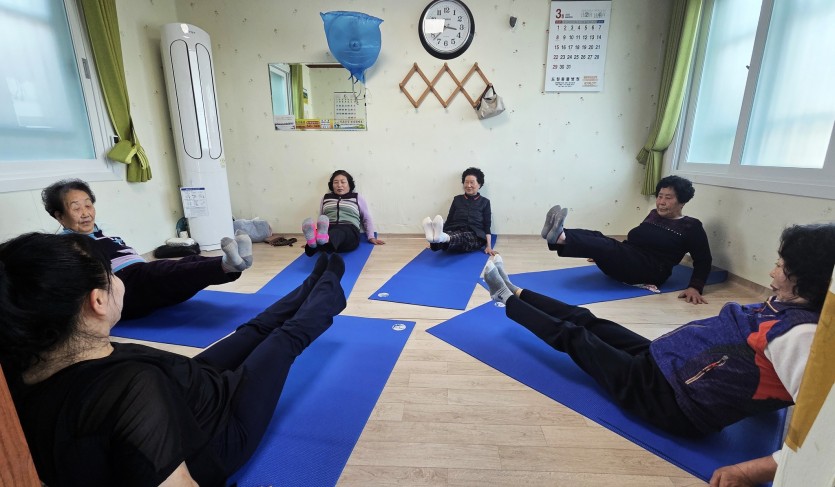 어느덧 이웃마을에 소문이 났는지 주민들이 함께 모여 앉아서 건강체조 삼매경에 푹 빠지셨습니다.