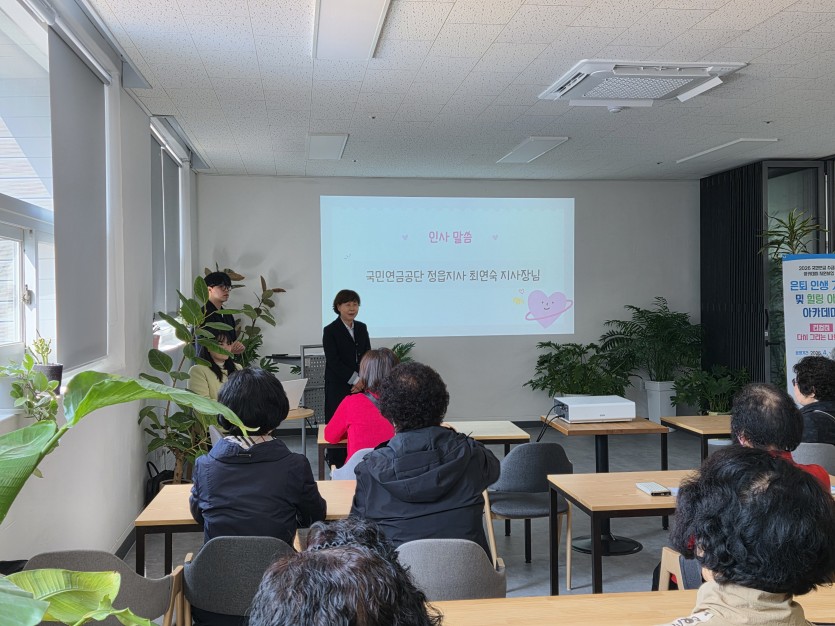 국민연금공단 정읍지사 최연숙 지사장님과 길보른종합사회복지관 김승래 부장님 인사말씀을 필두로 국민연금 수급자 아카데미 사업 소개, 프로그램 구성 및 운영 일정 안내, 참여자 유의사항 및 서류 제출 안내, 향후 교육 및 활동 방향 안내 등을 중심으로 진행되었으며, 참여자분들의 높은 관심 속에 뜻깊은 시간을 가질 수 있었습니다.