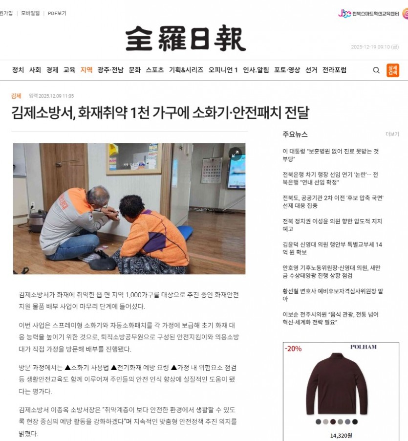 김제소방서, 화재취약 1천 가구에 소화기·안전패치 전달 <전라일보, 25.12.09>