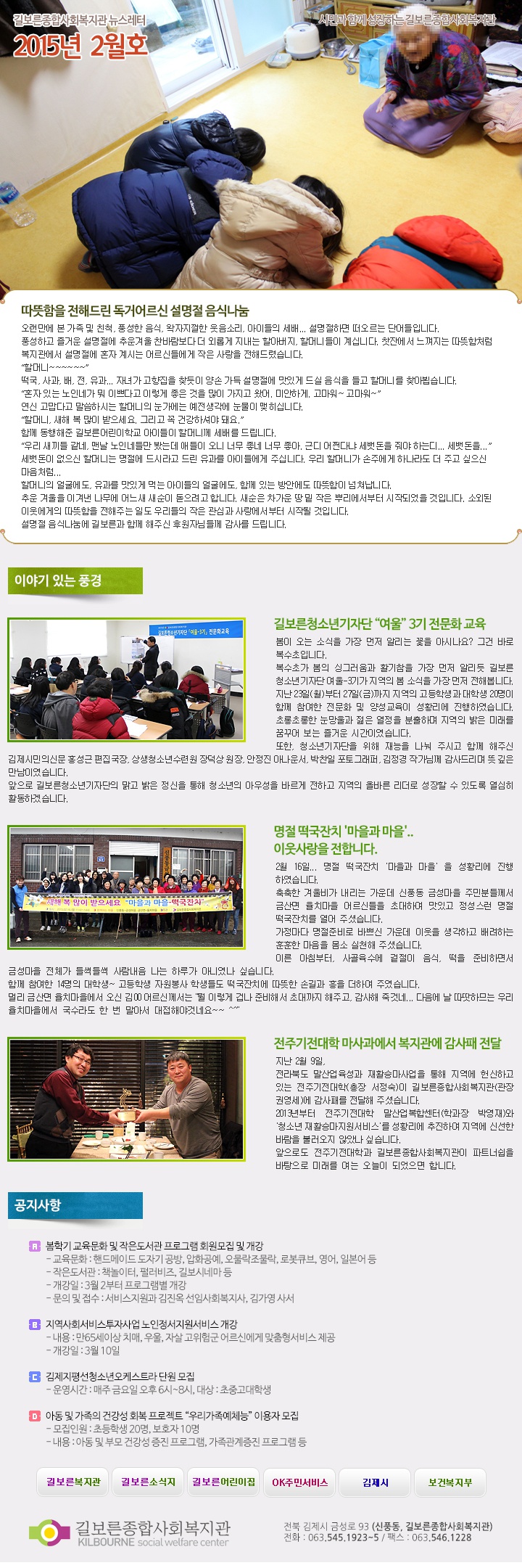 2015년 02월호 페이지 정보 작성자 관리자 댓글 0건 조회 3,938회 작성일 15-02-27 18:22 본문 . 관련링크 http://www.kilbo.or.kr/mail/mail_1502.html 4104회 연결 목록 이전글2015년 03월호 15.03.31 다음글2015년 01월호 15.02.27