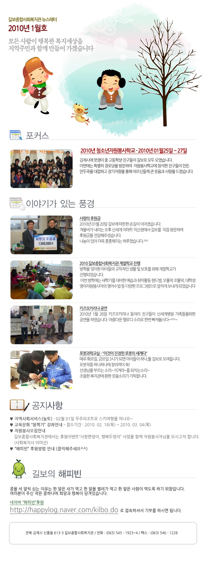 2010년 01월호 페이지 정보 작성자 하나정보시스템 댓글 0건 조회 3,339회 작성일 12-06-28 14:06 본문 2010년 01월호 관련링크 http://www.kilbo.or.kr/mail/mail_1001.html 3260회 연결 목록 이전글2010년 02월호 12.06.28 다음글2009년 12월호 12.06.28