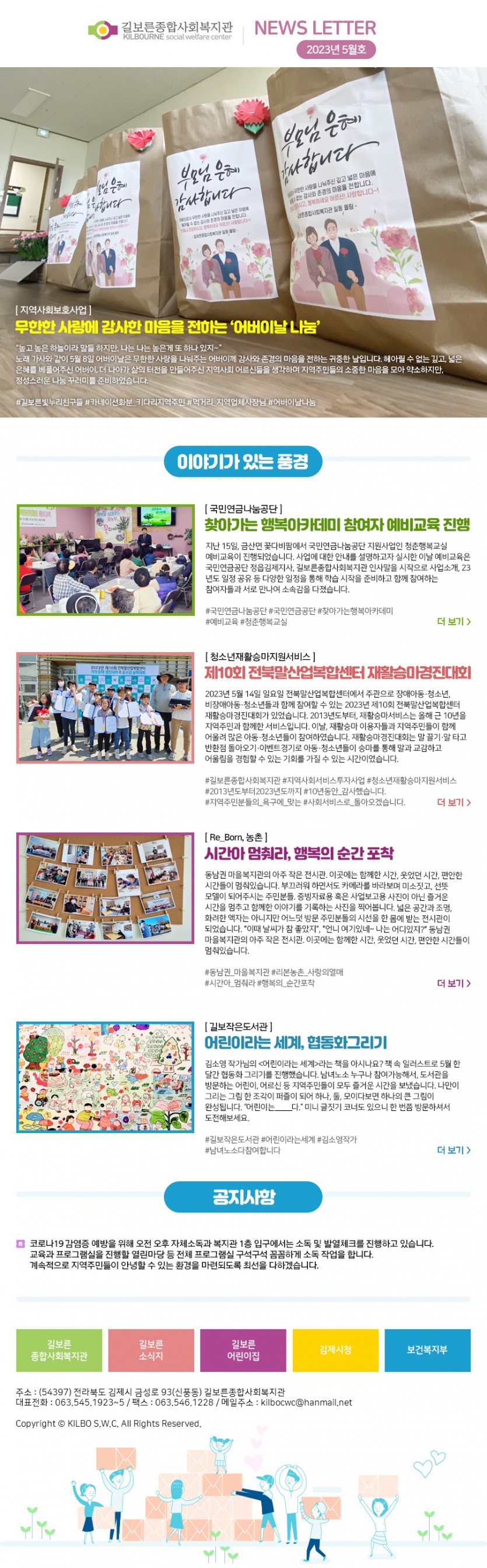 2023년 05월호 페이지 정보 작성자 관리자 댓글 0건 조회 3,325회 작성일 24-01-30 18:31 본문 . 관련링크 http://www.kilbo.or.kr/mail/mail_2305.html 2846회 연결 목록 이전글2023년 06월호 24.01.30 다음글2023년 04월호 24.01.30