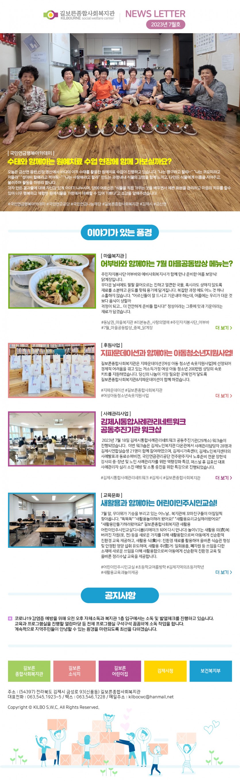 2023년 07월호 페이지 정보 작성자 관리자 댓글 0건 조회 3,309회 작성일 24-01-30 18:32 본문 . 관련링크 http://www.kilbo.or.kr/mail/mail_2307.html 3231회 연결 목록 이전글2023년 08월호 24.01.30 다음글2023년 06월호 24.01.30