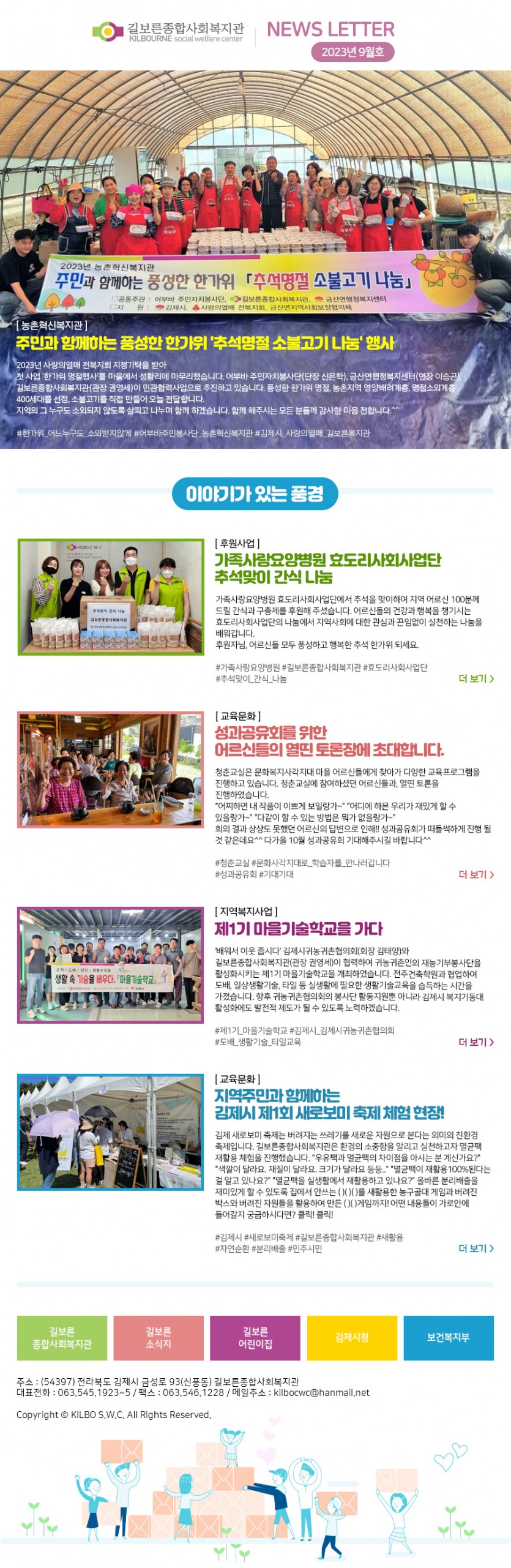 2023년 09월호 페이지 정보 작성자 관리자 댓글 0건 조회 3,225회 작성일 24-01-30 18:33 본문 . 관련링크 http://www.kilbo.or.kr/mail/mail_2309.html 3116회 연결 목록 이전글2023년 10월호 24.01.30 다음글2023년 08월호 24.01.30