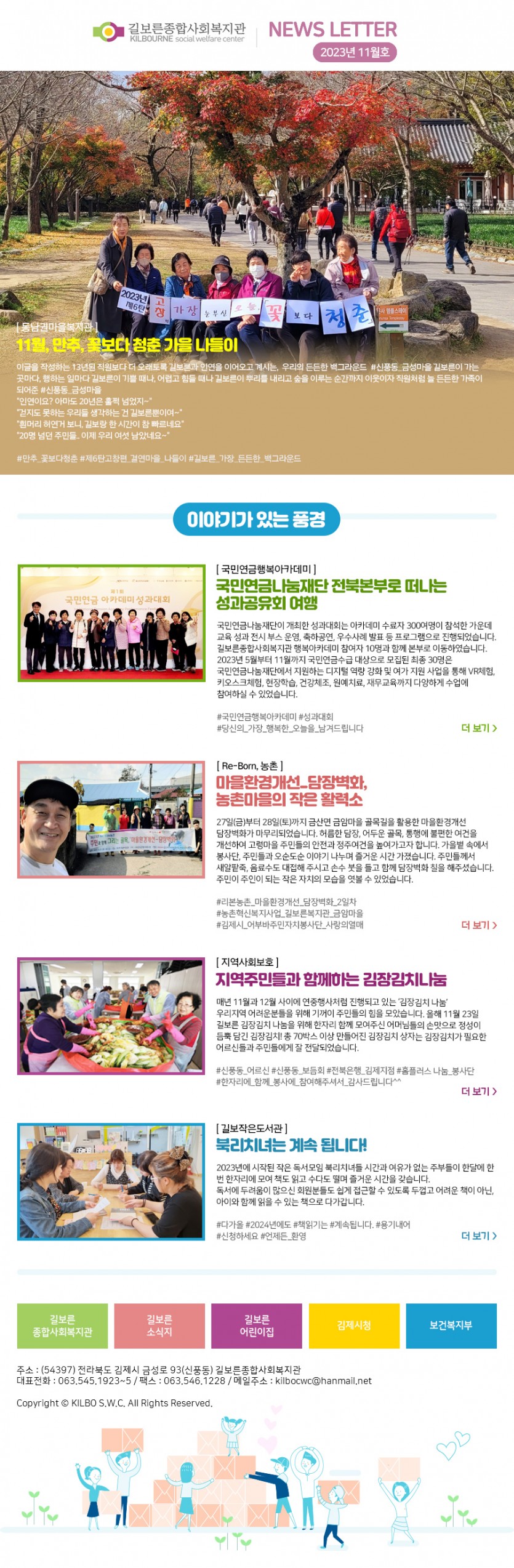2023년 11월호 페이지 정보 작성자 관리자 댓글 0건 조회 3,245회 작성일 24-01-30 18:34 본문 . 관련링크 http://www.kilbo.or.kr/mail/mail_2311.html 3115회 연결 목록 이전글2023년 12월호 24.01.30 다음글2023년 10월호 24.01.30