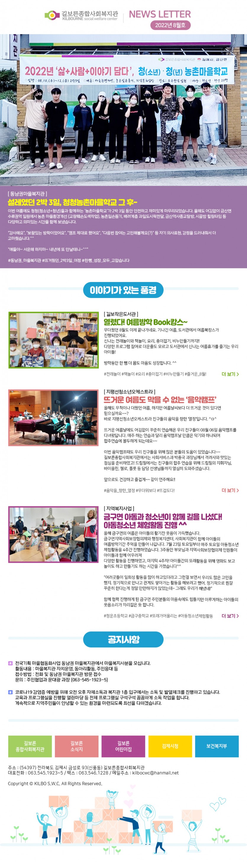 2022년 08월호 페이지 정보 작성자 관리자 댓글 0건 조회 3,377회 작성일 22-09-30 18:17 본문 . 관련링크 http://www.kilbo.or.kr/mail/mail_2208.html 3388회 연결 목록 이전글2022년 09월호 22.09.30 다음글2022년 07월호 22.08.03