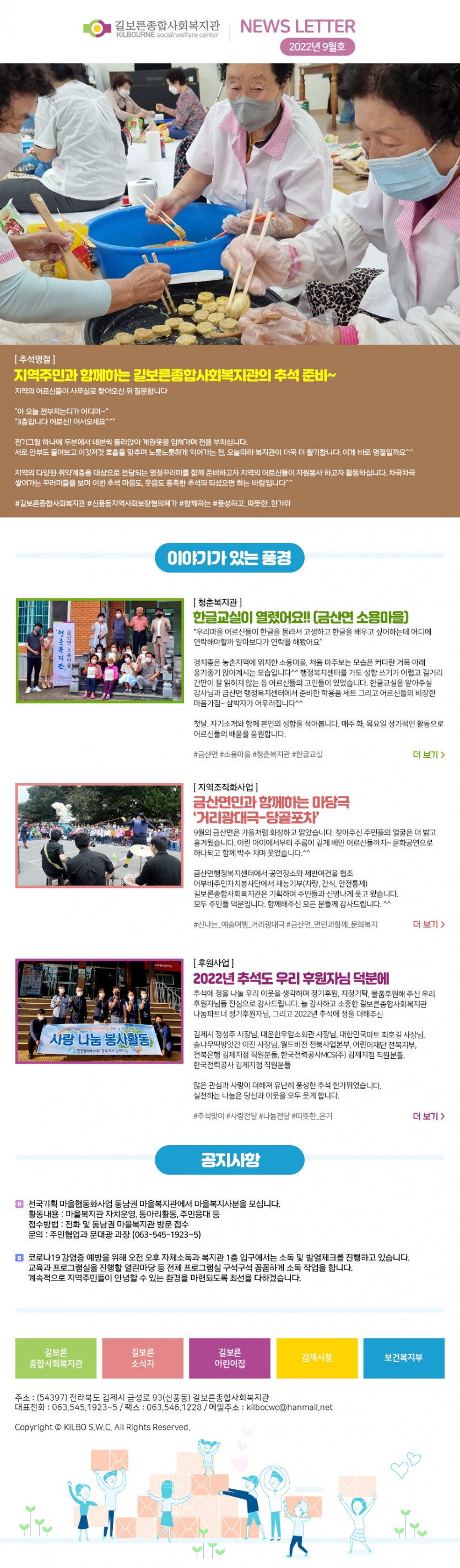 2022년 09월호 페이지 정보 작성자 관리자 댓글 0건 조회 3,304회 작성일 22-09-30 18:17 본문 . 관련링크 http://www.kilbo.or.kr/mail/mail_2209.html 2911회 연결 목록 이전글2022년 10월호 22.11.22 다음글2022년 08월호 22.09.30