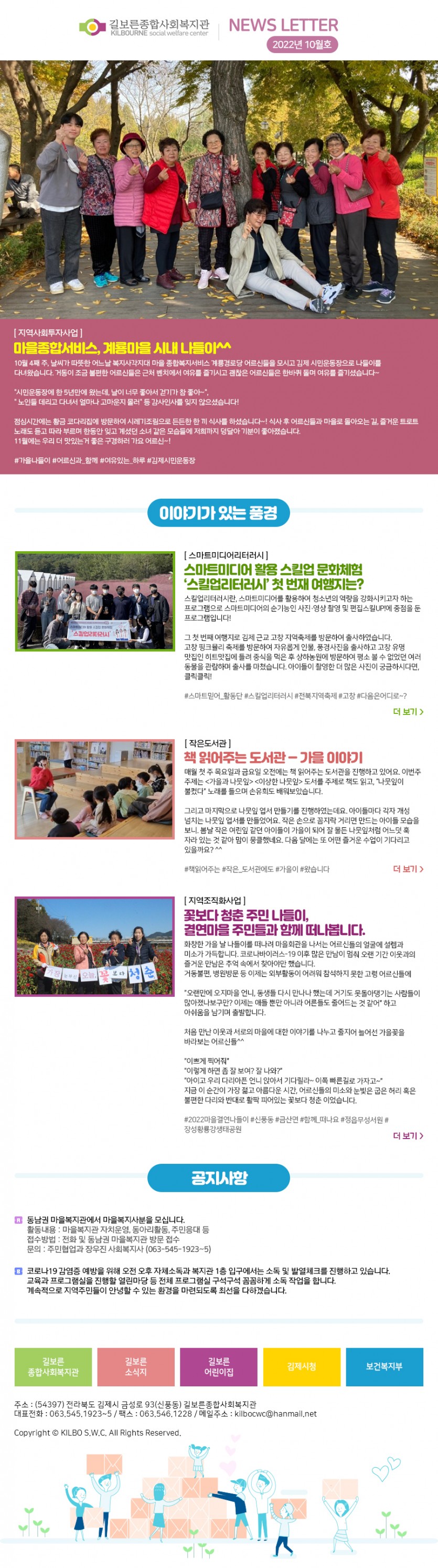 2022년 10월호 페이지 정보 작성자 관리자 댓글 0건 조회 3,277회 작성일 22-11-22 10:08 본문 . 관련링크 http://www.kilbo.or.kr/mail/mail_2210.html 3242회 연결 목록 이전글2022년 11월호 22.12.07 다음글2022년 09월호 22.09.30