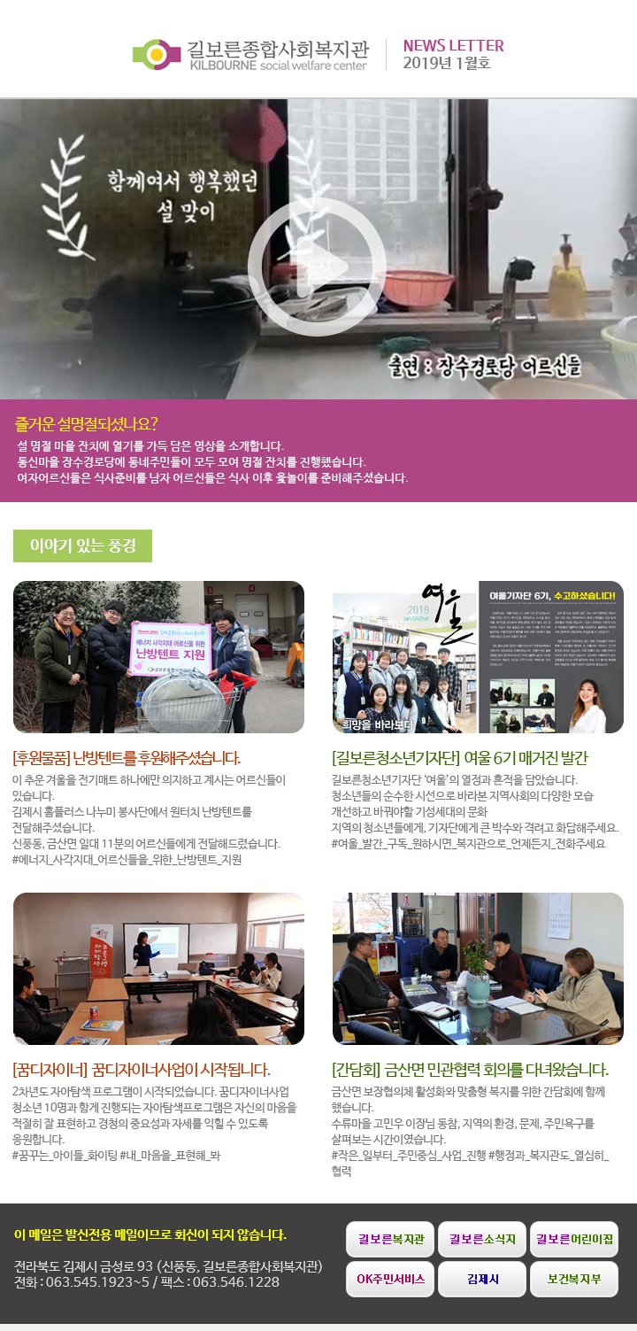 2019년 01월호 페이지 정보 작성자 관리자 댓글 0건 조회 3,501회 작성일 19-05-22 14:35 본문 . 관련링크 http://kilbo.or.kr/mail/mail_1901.html 3632회 연결 목록 이전글2019년 03월호 19.05.22 다음글2018년 10월호 18.11.12