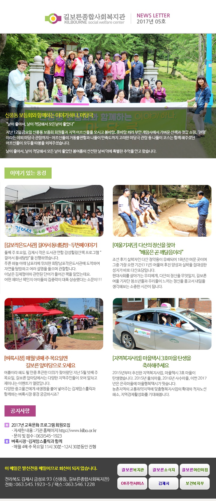 2017년 05월호 페이지 정보 작성자 관리자 댓글 0건 조회 4,096회 작성일 17-10-12 11:31 본문 . 관련링크 http://www.kilbo.or.kr/mail/mail_1705.html 3559회 연결 목록 이전글2017년 06월호 17.10.12 다음글2017년 04월호 17.10.12