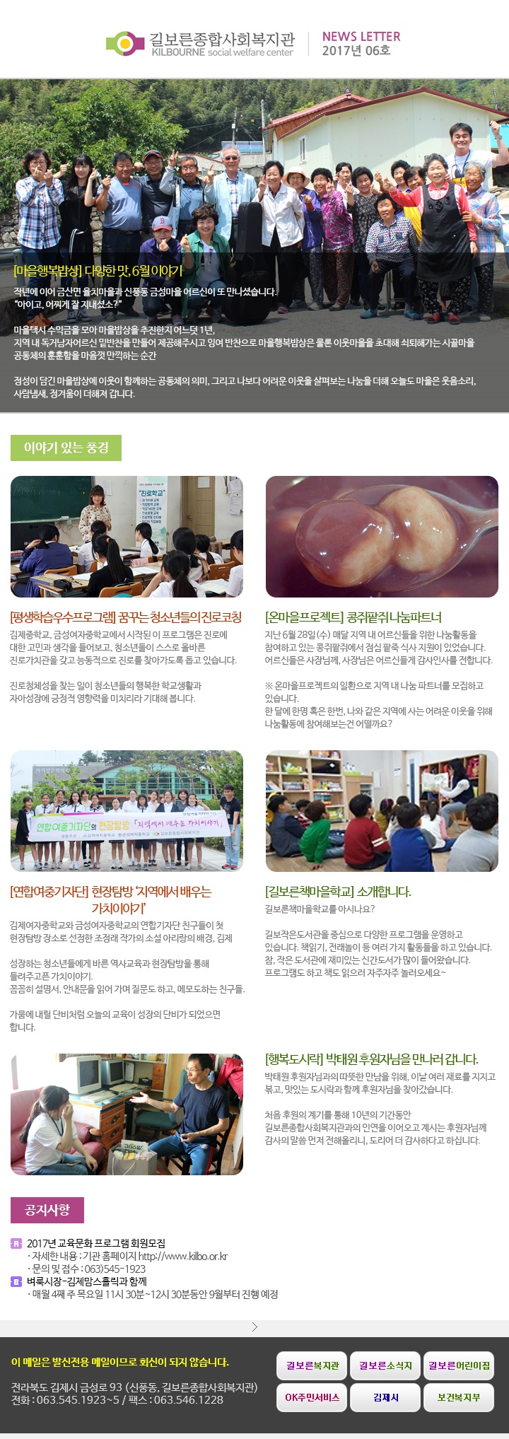 2017년 06월호 페이지 정보 작성자 관리자 댓글 0건 조회 4,106회 작성일 17-10-12 11:32 본문 . 관련링크 http://www.kilbo.or.kr/mail/mail_1706.html 4185회 연결 목록 이전글2017년 07월호 17.10.12 다음글2017년 05월호 17.10.12